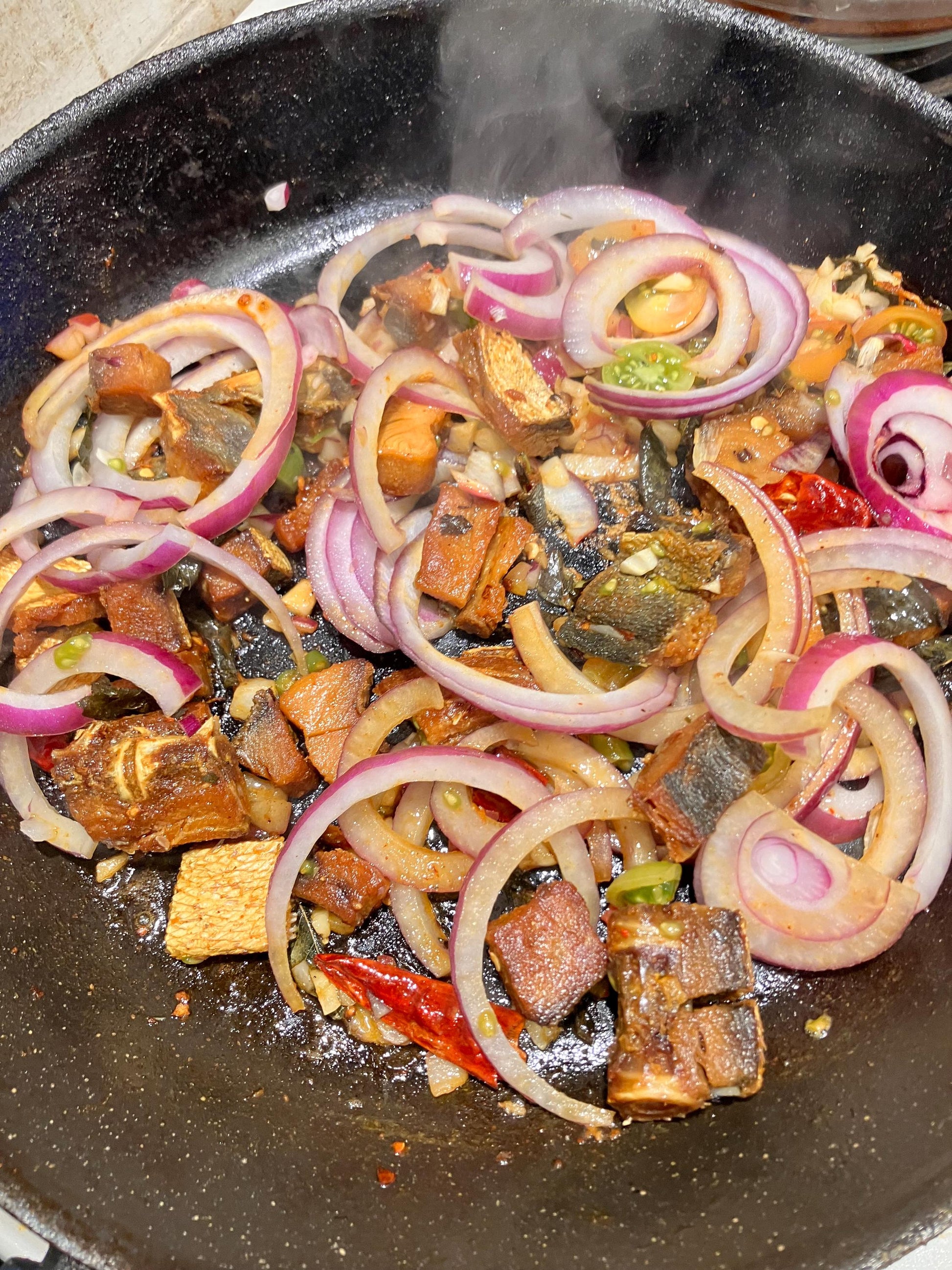 Prepare the Fish: Soak the dried Katta fish in water for about 10-15 minutes to remove excess salt. Drain and cut into small pieces.